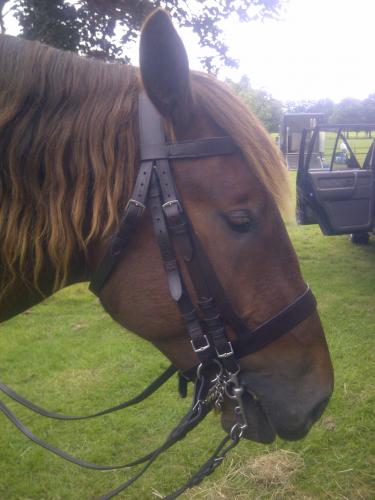 This is a double bridle made to fit the heavy horse breeds for dressage disciplines. This example I made is on a suffolk punch. This style of bridle will be tailor made to fit your horse once I have the measurements I need. It is available in black or dark havana oak bark tanned bridle leather.with double reins in 5/8 and 3/4 inch wide, available in plain leather and rubber grips in a large or small pimple. I can supply rugby pelhams for use with double reins with either a jointed centre, mullen mouth or with a french link to suit your horse, available in 6", 6.5", 7", and on enquiry to check for availability in 7.5". Or the traditional weymouth and bradoon bits in these sizes are available. please feel free to contact me for advice. prices available on request.